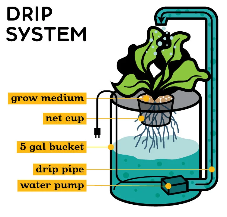 The drip system is going to introduce a new hardware piece to you by adding a hose or pipe that extends from your liquids tank to above your plants. The pump is kept at a low-ish level so that it runs a small but consistent amount to the top and it drips on to your plant or roots consistently, and even just for a certain time cycle, rather than drowning the plant with no end in sight.